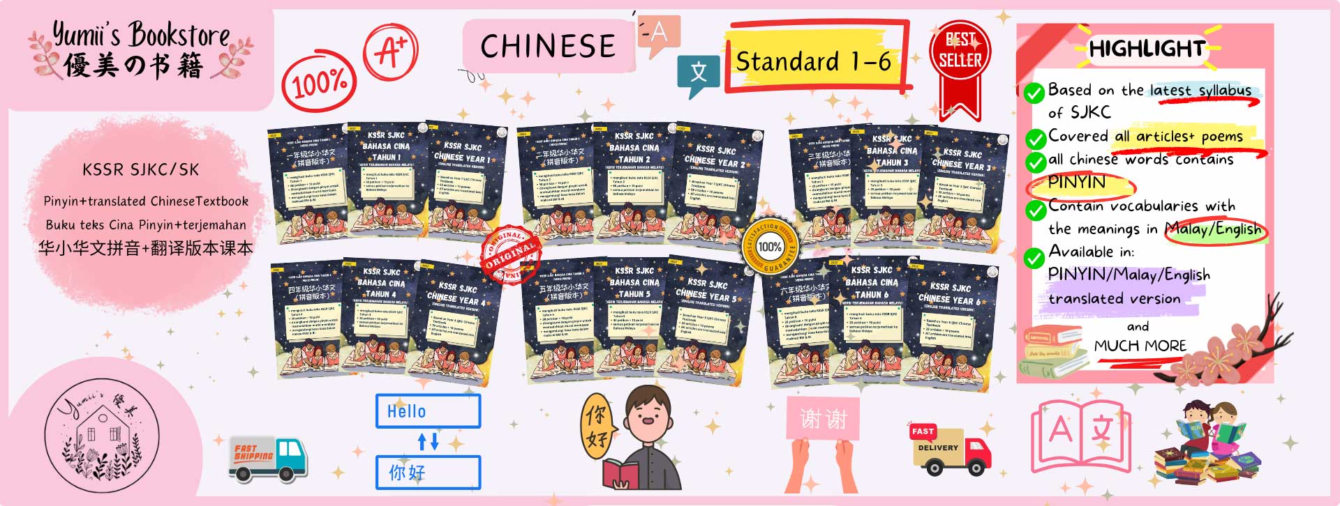 These books are a hidden treasure for those who are facing difficulties in learning in SJKC schools as it has pin yin as well as English / BM translations. The seller also gave an update on the tracking number and is very pleasant to talk to. Will definitely purchase again in future. Keep up the good work!